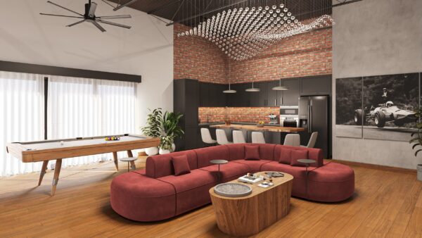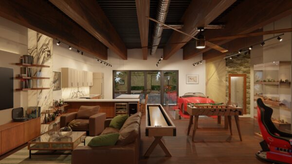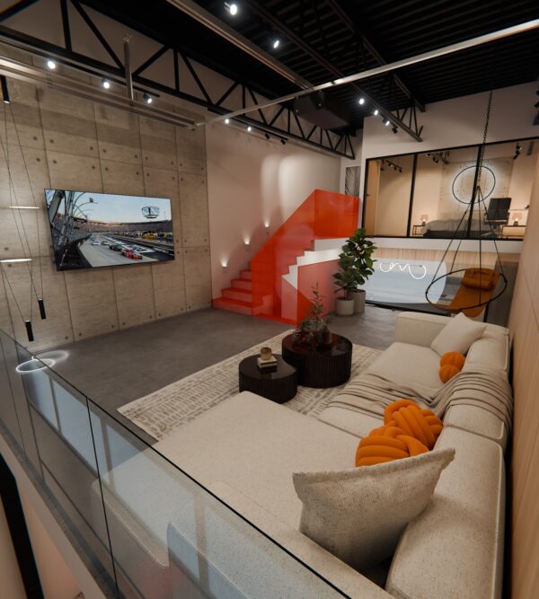 TME 1307 This luxury garage, with panoramic views of a private racetrack, is designed as an immersive fusion of high-octane performance, family play, and rock-and-roll spirit. The space features a full mezzanine, a sleek kitchen that doubles as a bar, a bedroom, bathroom, arcade zone, race simulator, and a car lift—all layered with details that…